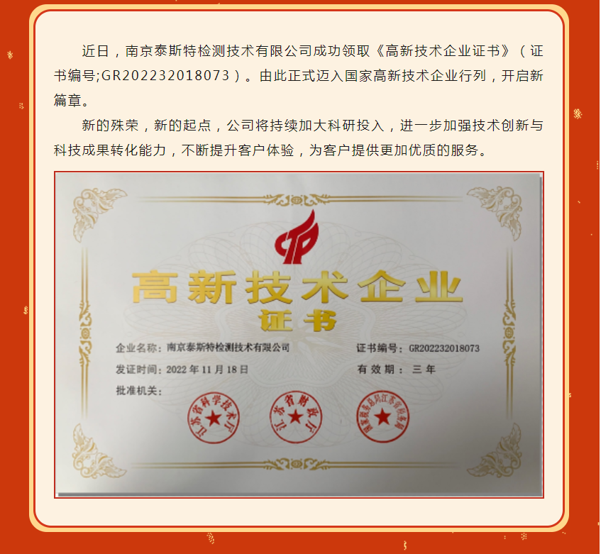 喜讯!南京泰斯特荣获“国家高新技术企业”证书